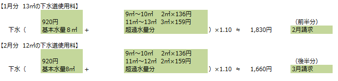 使用水量を、1月分(11月使用分)13㎥と2月分(12月使用分)12㎥に分けて使用料を計算します。